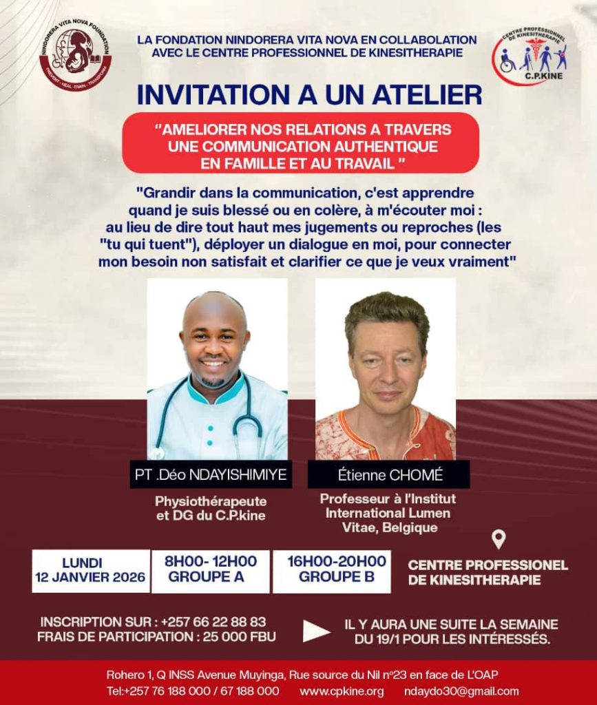 NINDORERA Vita Nova Foundation en Collaboration avec le Centre Professionnel de Kinésithérapie (C.P.KINE) dans le cadre d’un objectif commune de prévention des troubles musculo-squelettiques, ils ont eu un coup de main du professeur ETIENNE CHOME arrivé au Burundi pour dispenser la formation sous le thème « Améliorer nos relations à travers une communication authentique en famille et au travail ».